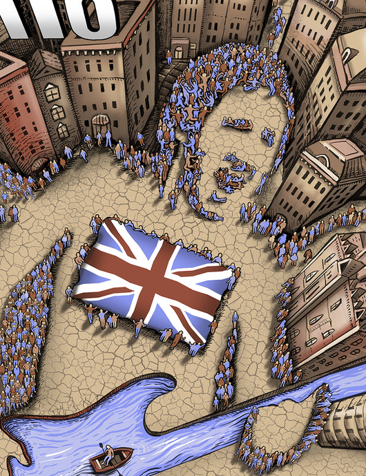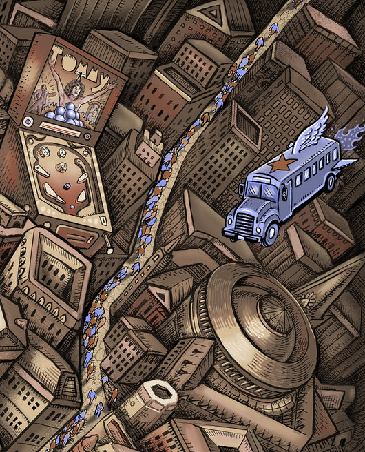 showing a crowd gathering from all over, and both Pete Townshend and Roger Daltrey in their iconic poses, along with various song references; Boris the Spider, Squeezebox, Pinball Wizard, Magic Bus, etc.